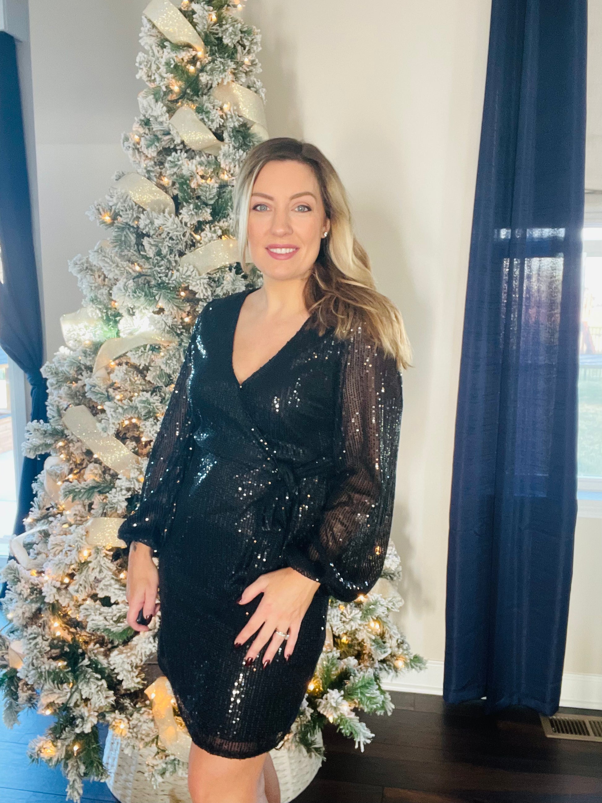 Rock your winter events in this black sequin faux wrap midi dress featuring a v-neck, sheer long sleeves with elastic at wrists, & elastic waist with tie detail. Snap button closure at chest. Fully lined.