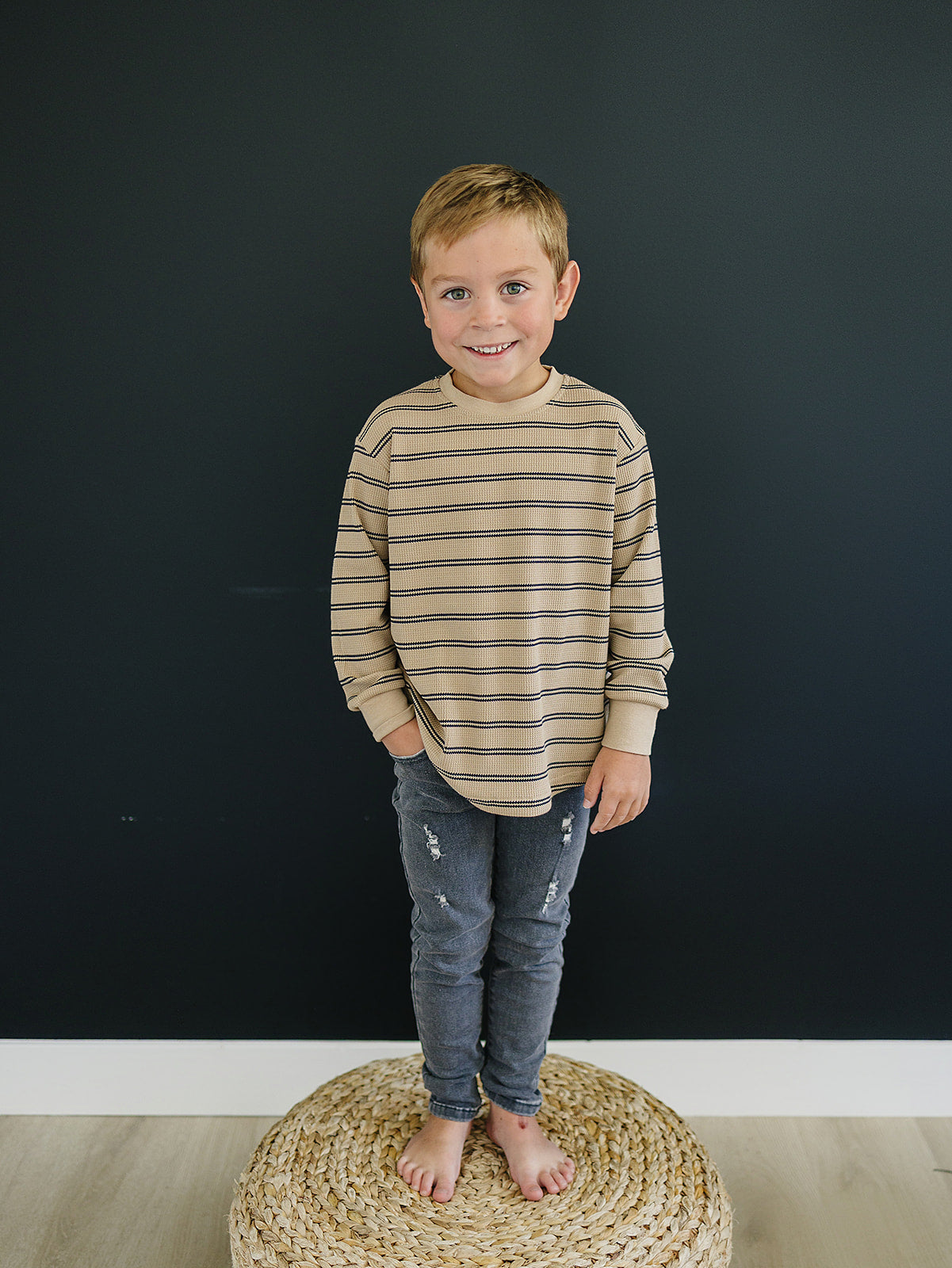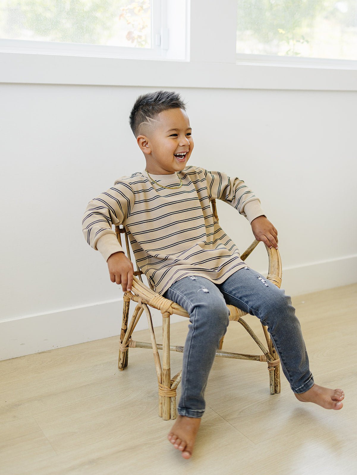 The Charlie Jeans are made for little adventurers who love style and comfort. Featuring distressed legs for that cool, worn-in vibe, these jeans have an elastic waistband and a functional drawstring to ensure the perfect fit every time. The tapered legs give a trendy skinny jean look, and with two versatile colors available, mixing and matching with any top is a breeze. Perfect for playdates or family outings, these jeans bring fun and fashion together effortlessly.