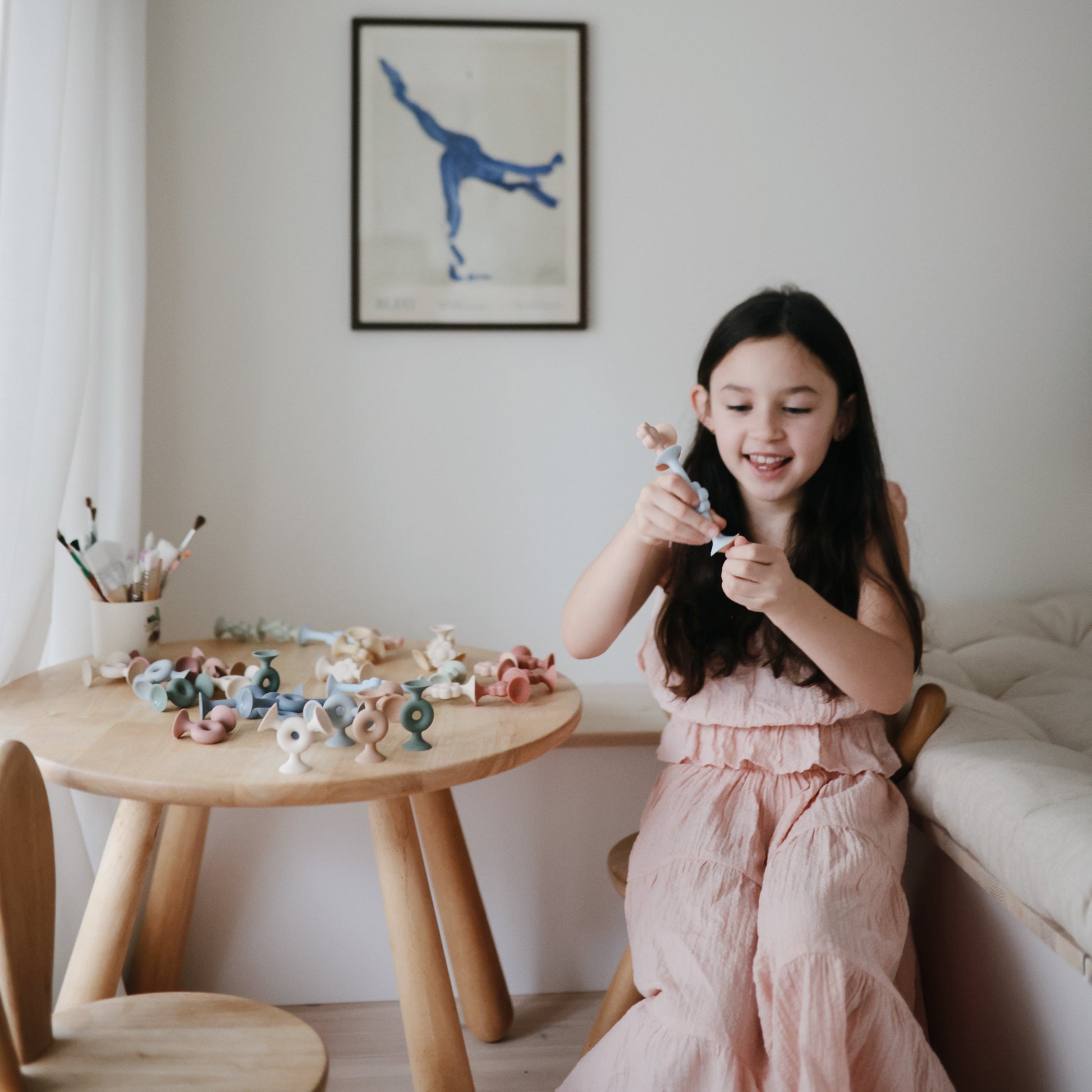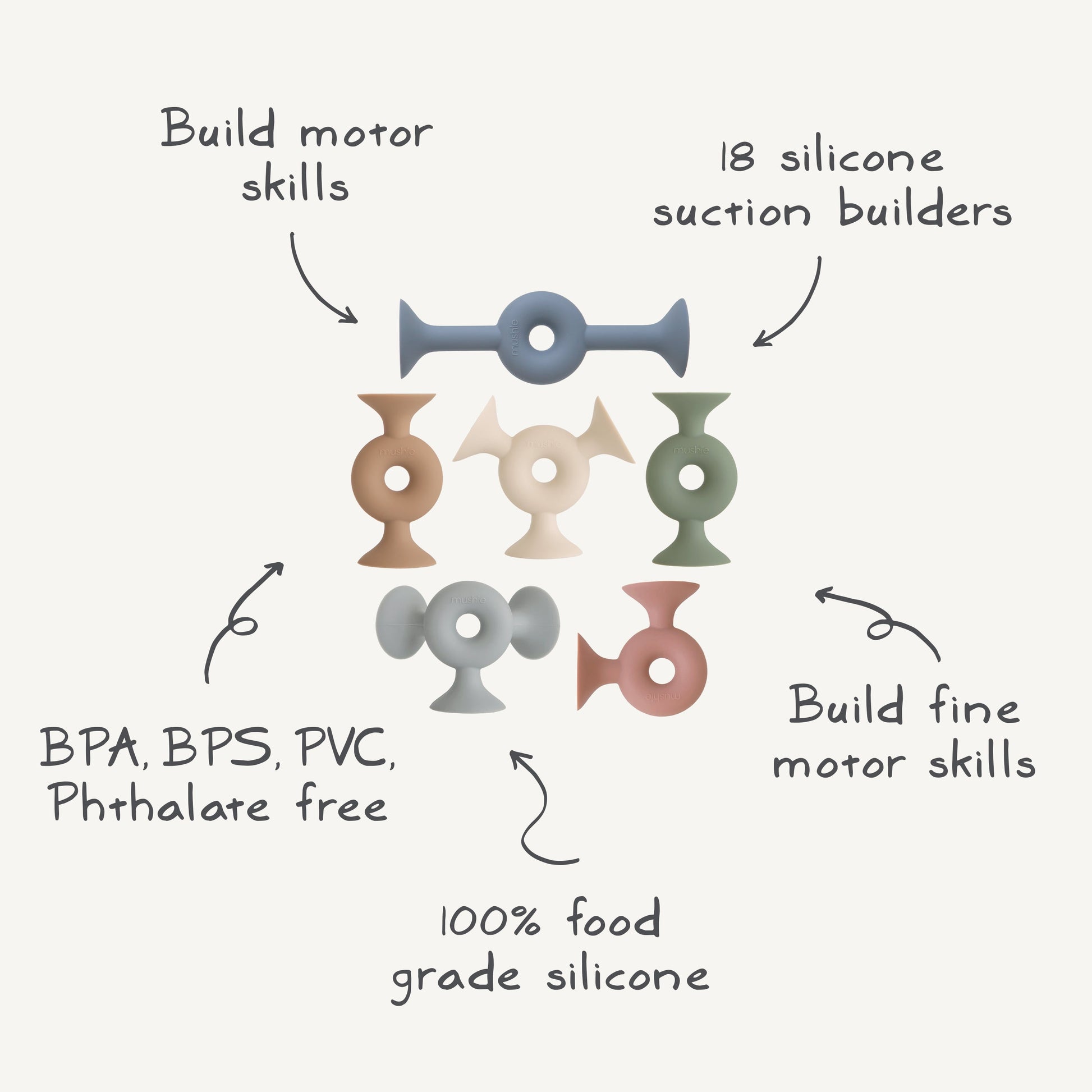 Unleash creativity and fun with this set of 18 silicone suction builder toys. Made from flexible, non-toxic silicone, the pieces easily connect, stack, and stick to smooth surfaces for a versatile toy during play time or bath time. Ideal for fostering motor skills and spatial awareness with endless opportunities to explore and create. When playtime is over, they neatly store away in a reusable storage container that keeps everything organized and ready for the next creation.
