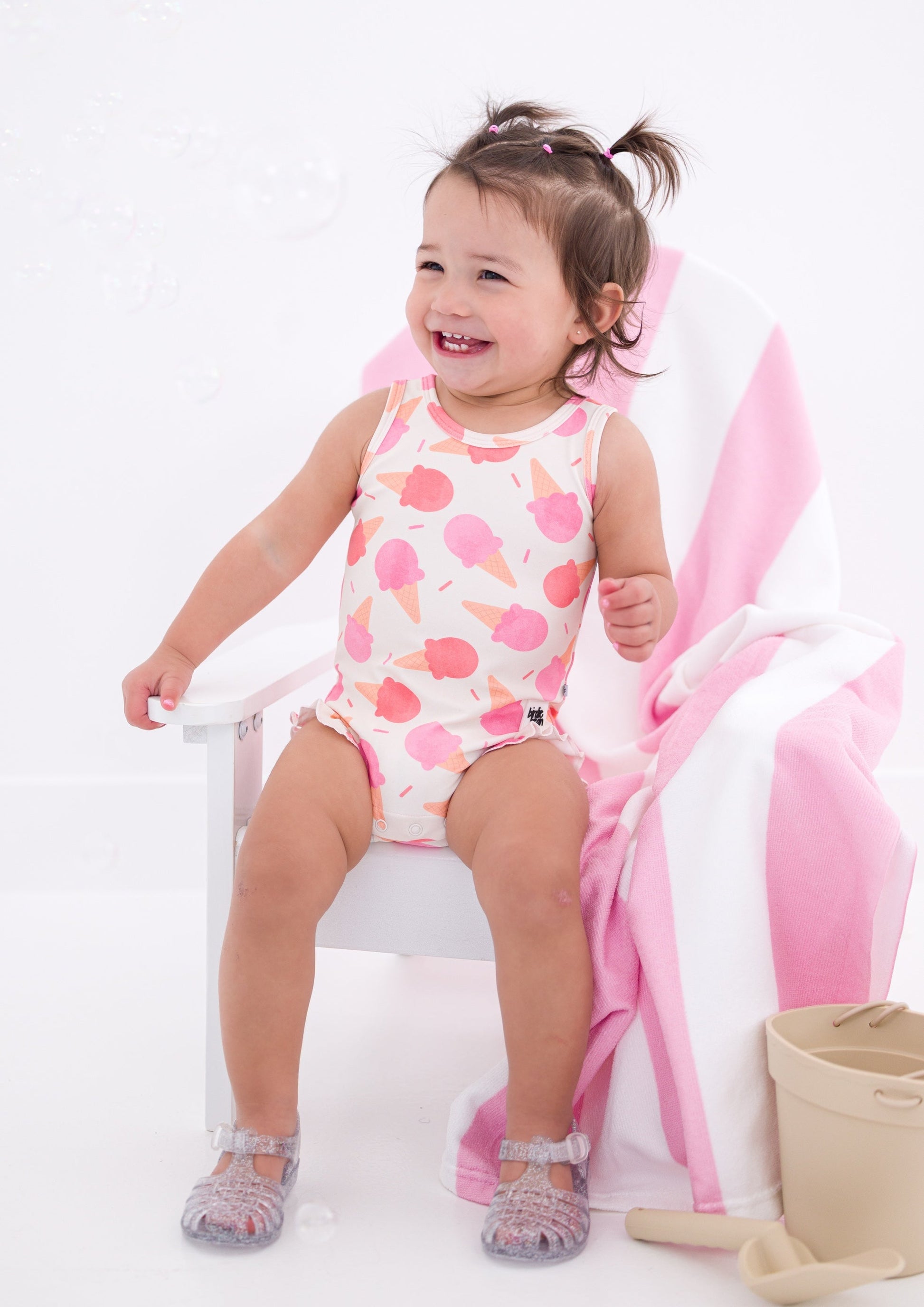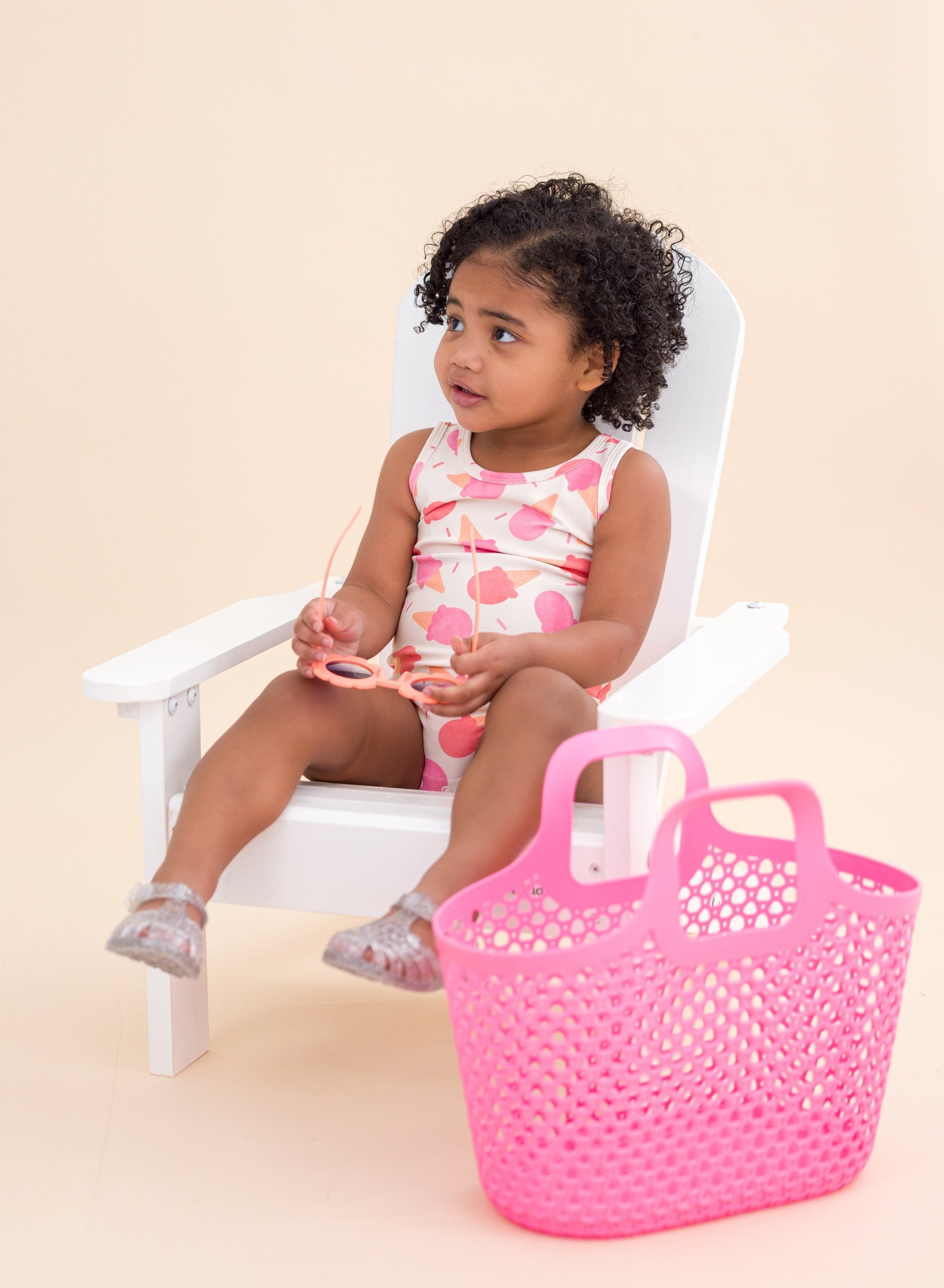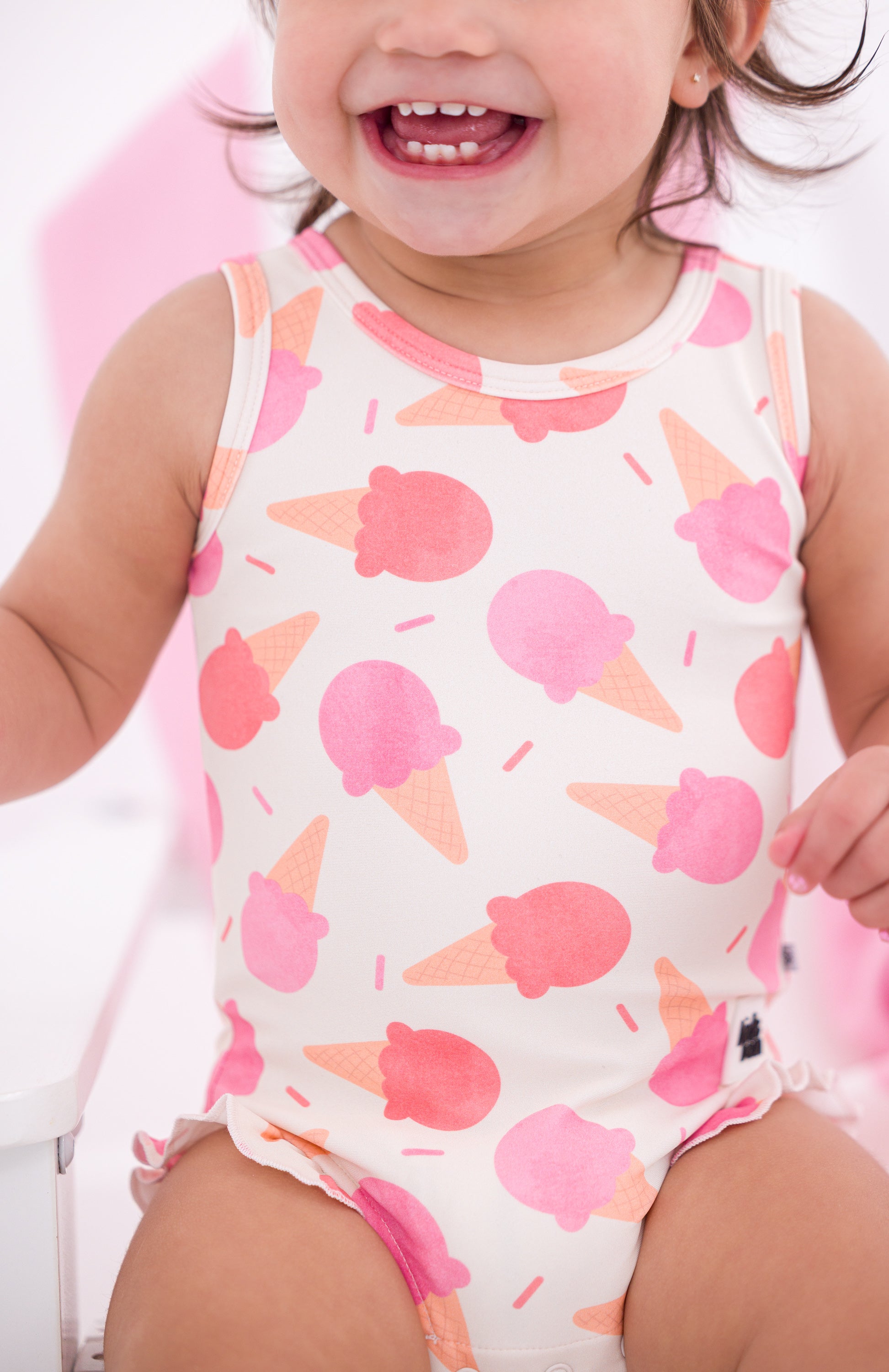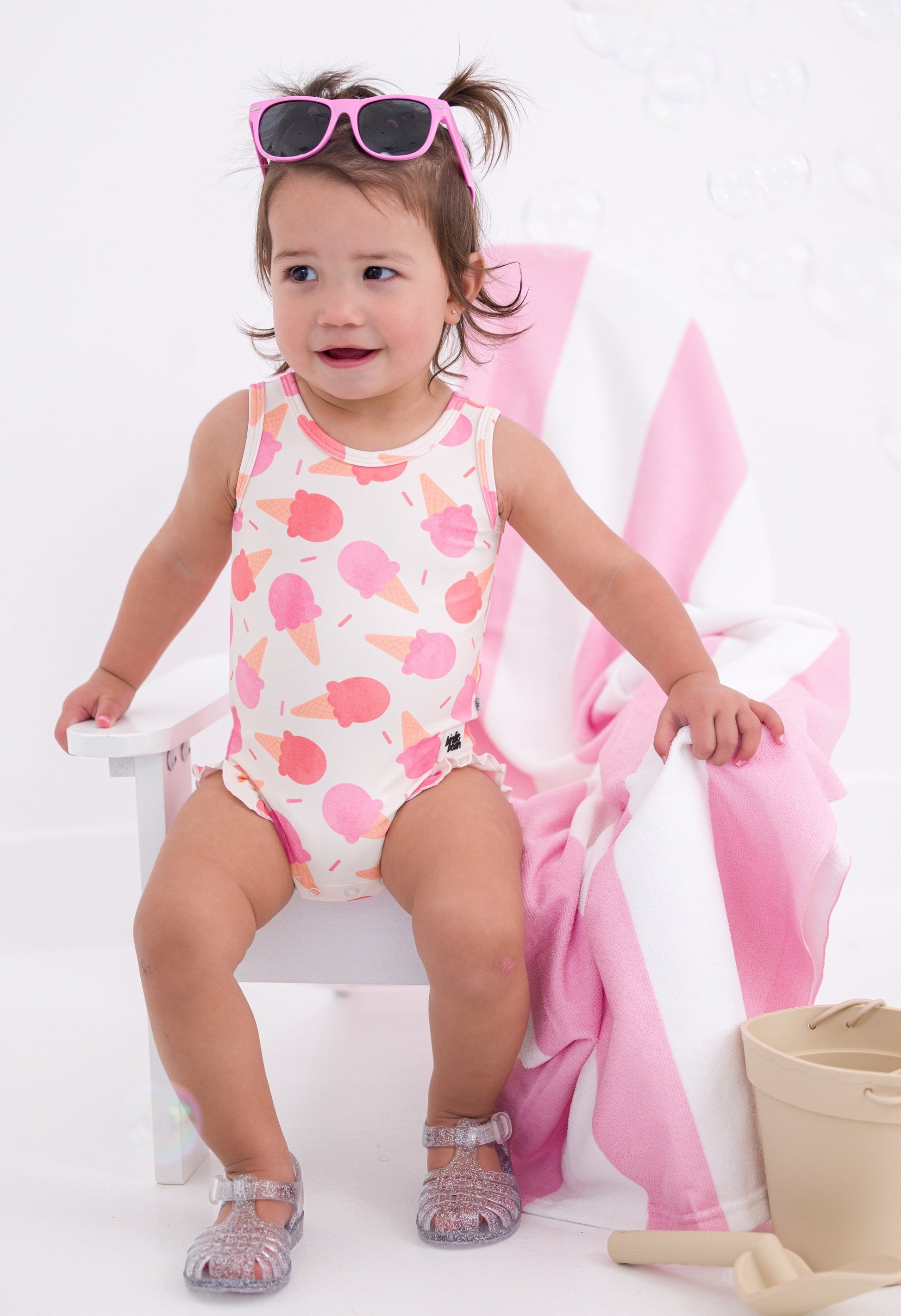 Make a splash with the sweetest swim of the season! This adorable one-piece swimsuit features a fun and playful ice cream print—perfect for all your little one’s sunny adventures. Fully lined for comfort and crafted from high-quality swim fabric, it’s made to move, play, and soak up every summer memory.