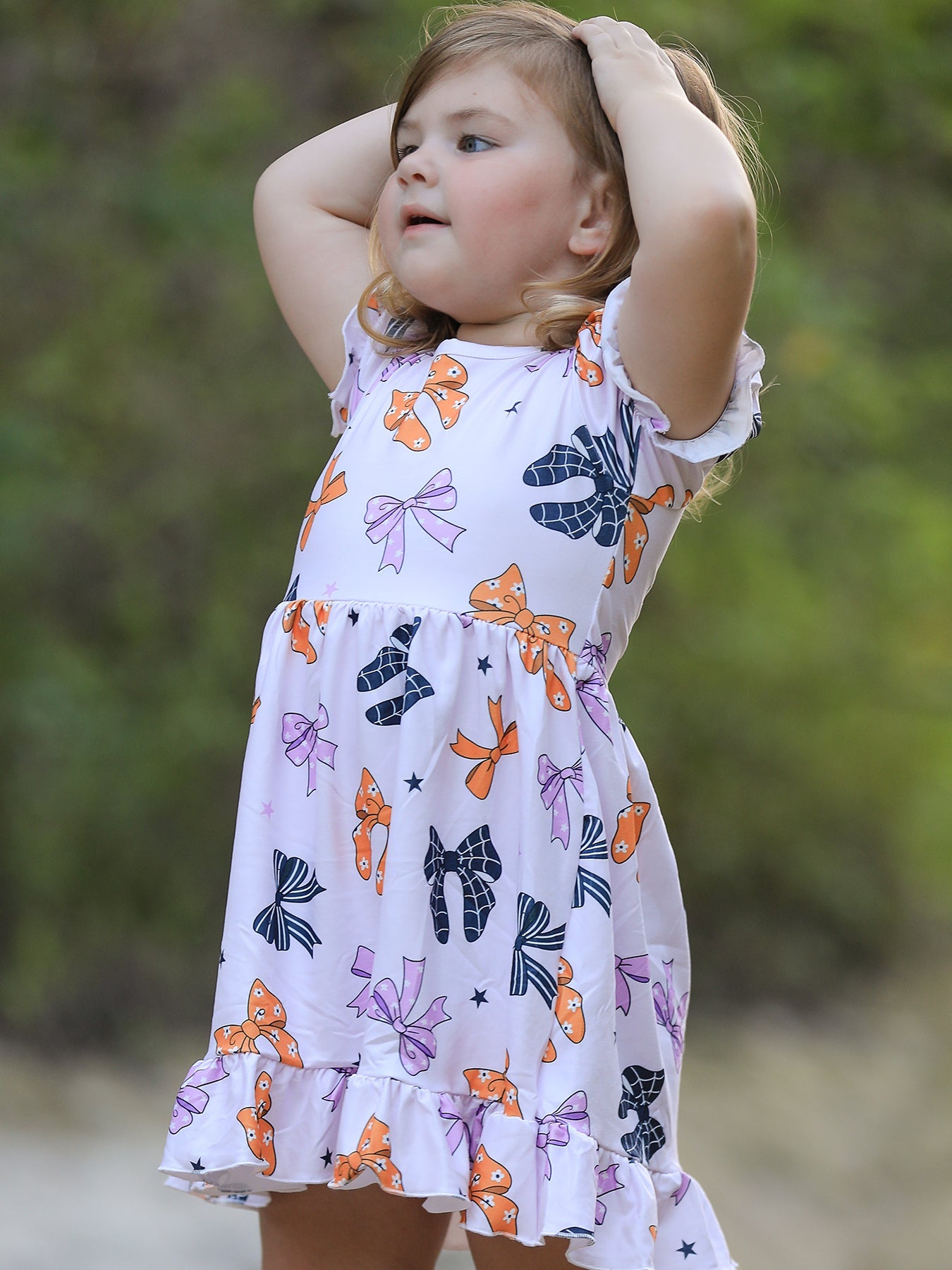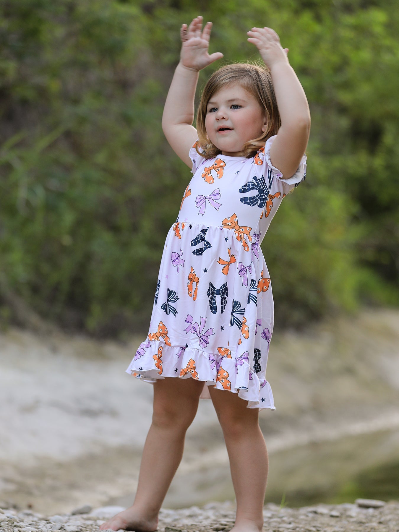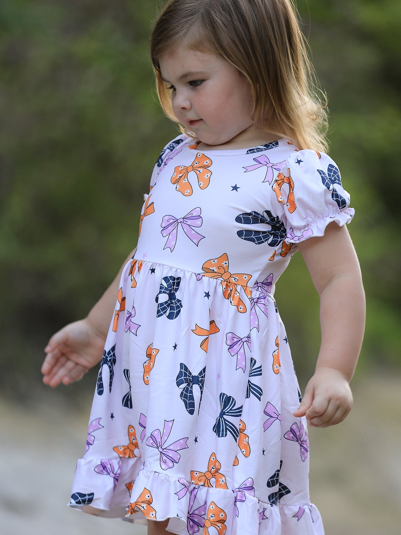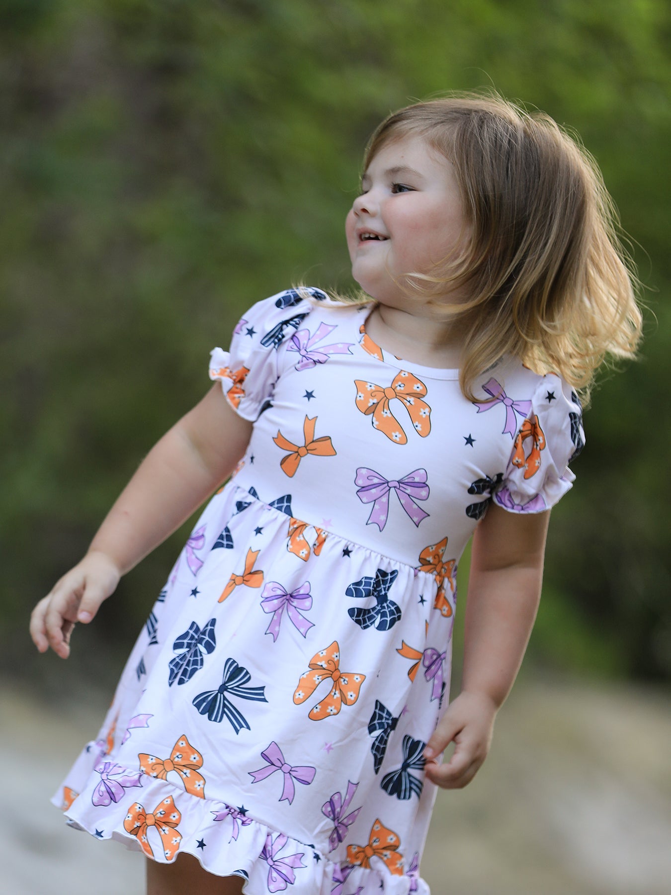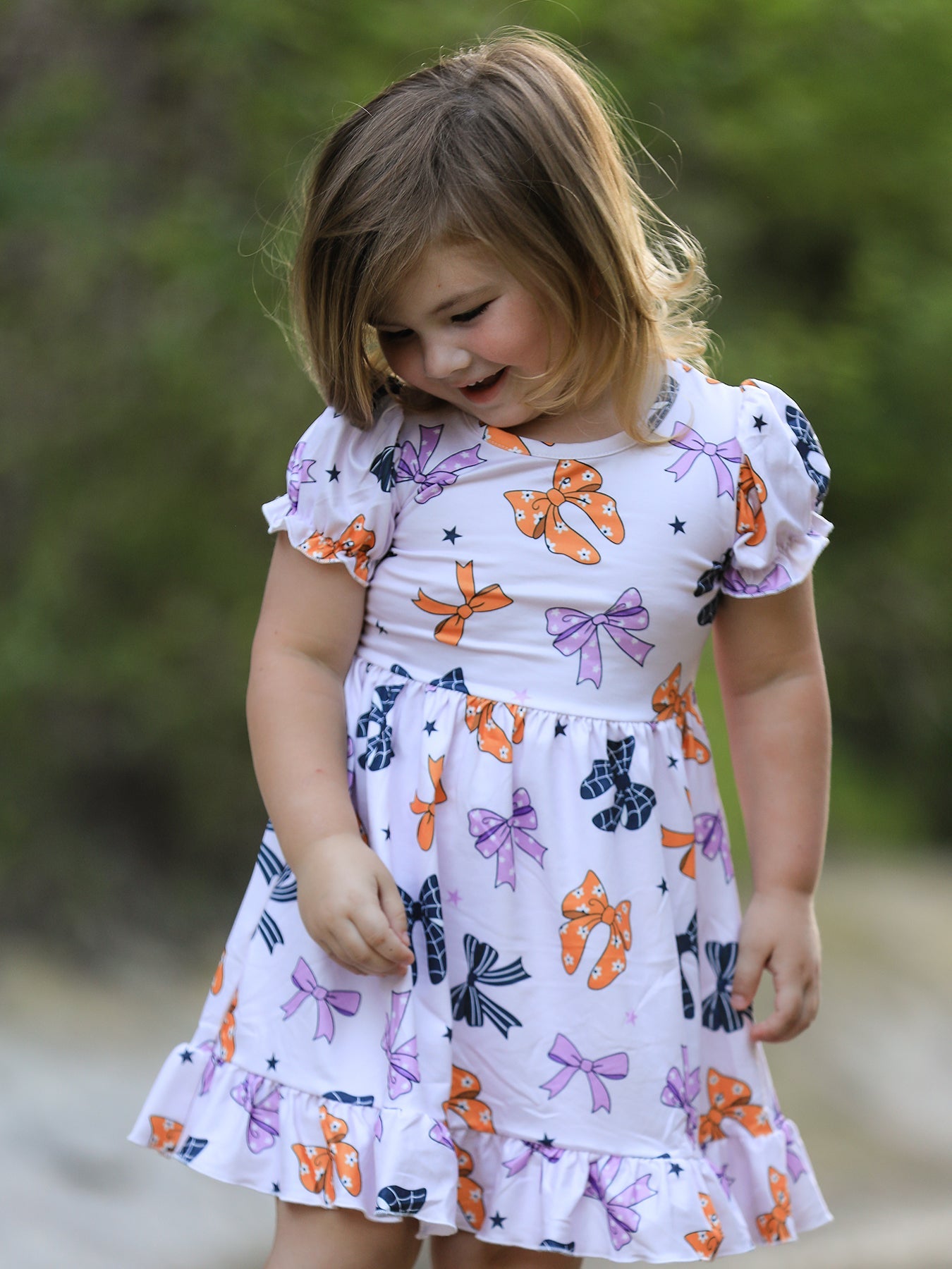 This Halloween, dress your little girl in style with our adorable Bow Print Dress! Featuring a fun and festive Halloween print, this dress will have your child looking cute and feeling confident. Made with high-quality materials, it's comfortable and durable for all-day wear. Perfect for any Halloween event or costume party, this dress is a must-have for the season.