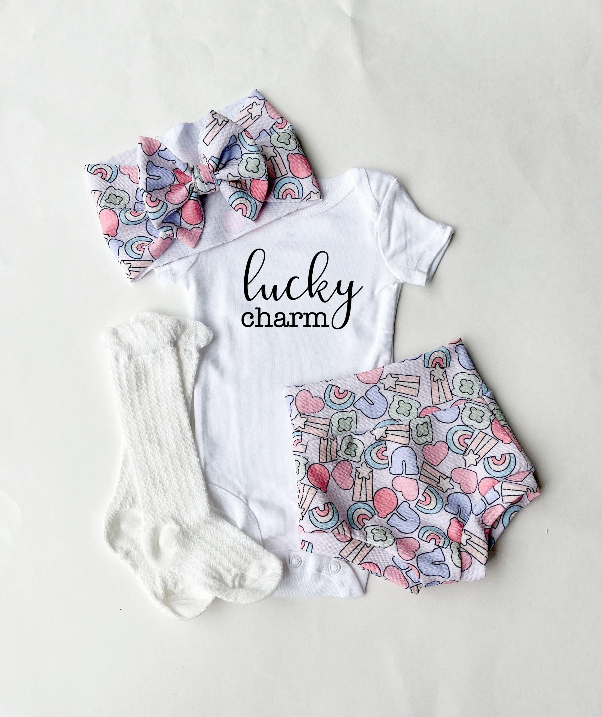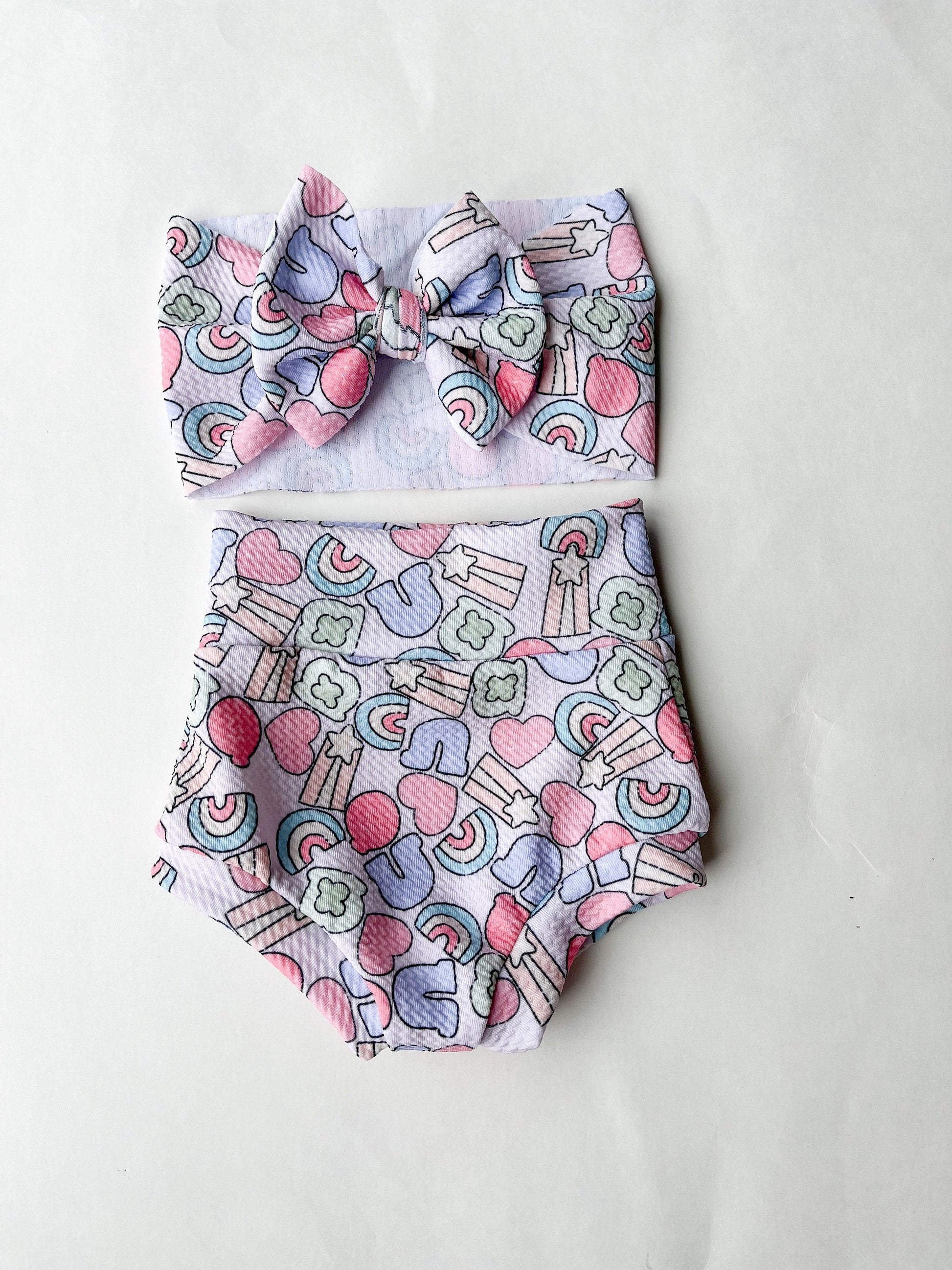 This adorable baby outfit set features soft and stretchy high waisted bummies, head-wrap bow and coordinating baby bodysuit. Our bodysuits feature buttery soft cotton, perfect for babies delicate skin. Bummies are trendy, comfortable, and make the most adorable gift!
