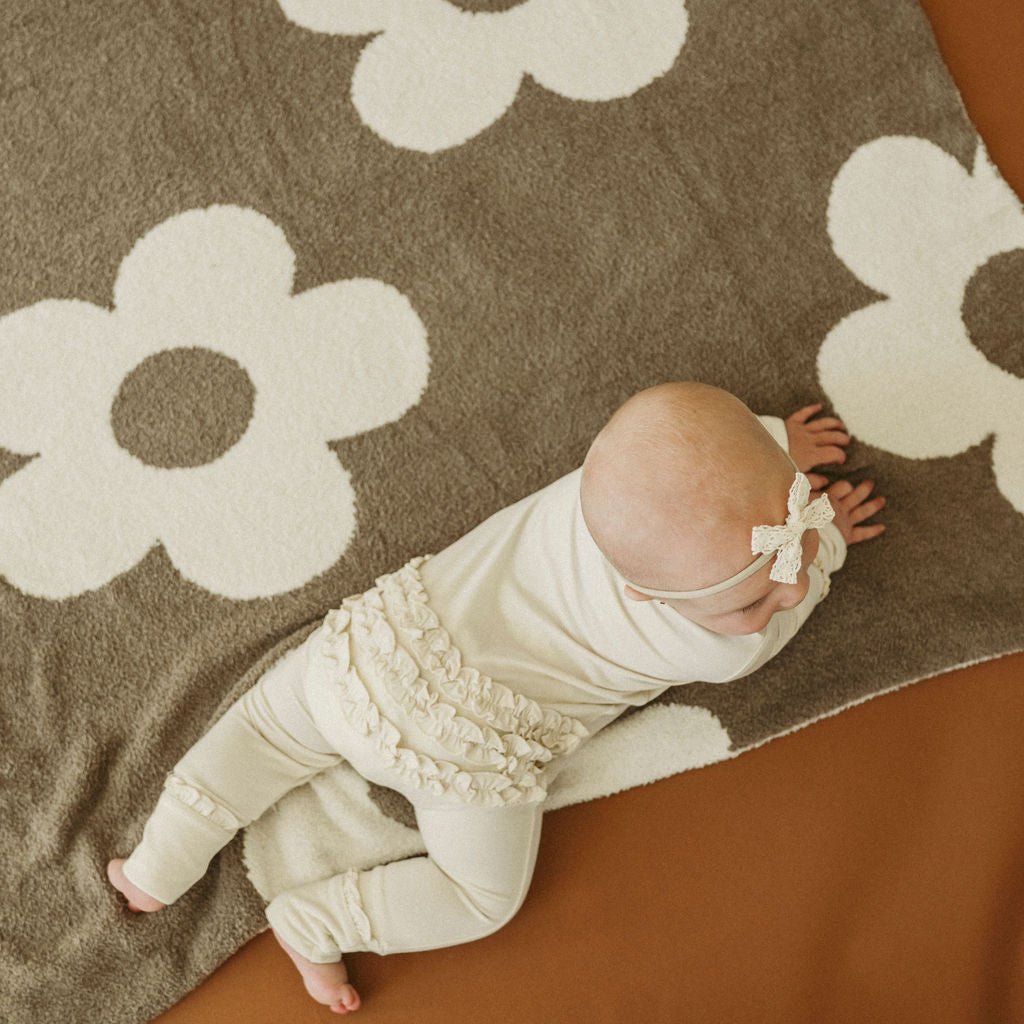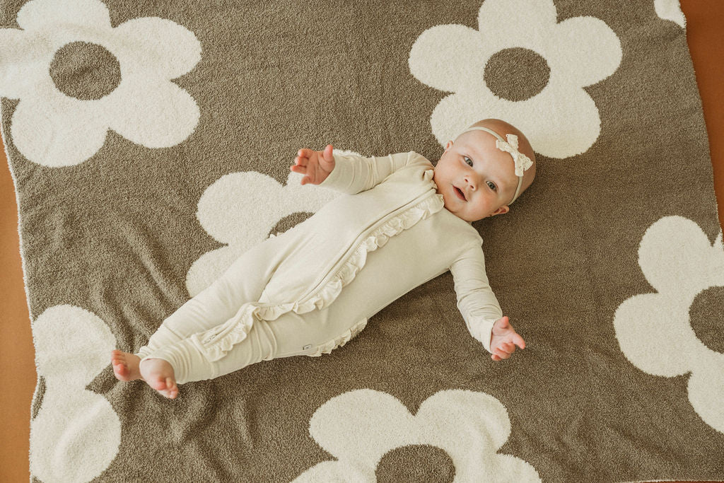 This cream bamboo ruffle outfit makes the perfect going home outfit or gift. Made from naturally soft and lightweight bamboo viscose material to keep your baby comfortable. A one-piece outfit that features a 2 way zipper that runs from the neck to the ankle making those diaper changes super easy! Fold over cuffs to keep baby from scratching and to keep their little hands warm.