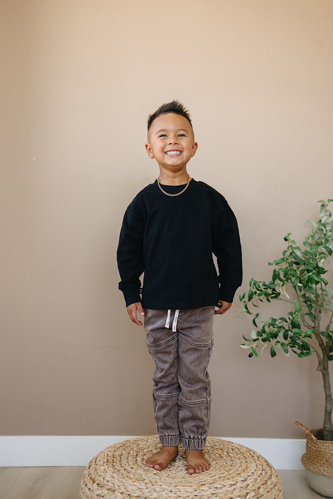Designed for comfort and style, these Shea Jeans feature a baggy fit your little one will adore. The functional drawstring and elastic waistband make getting dressed easy, while horizontal seams add a cool touch. Elastic ankle cuffs ensure a comfy fit that moves with them all day long. Perfect for playful adventures!