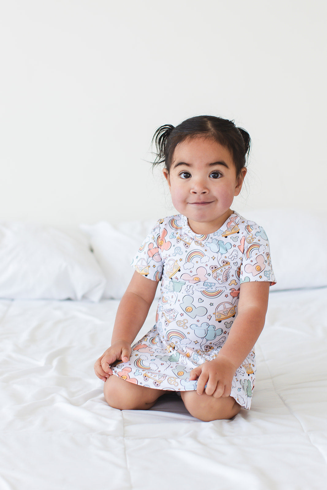 Crafted from buttery-soft, breathable bamboo viscose, these dresses provide all-day comfort for your little one. The built-in bodysuit includes snap closures for quick and hassle-free diaper changes, making them as practical as they are adorable.