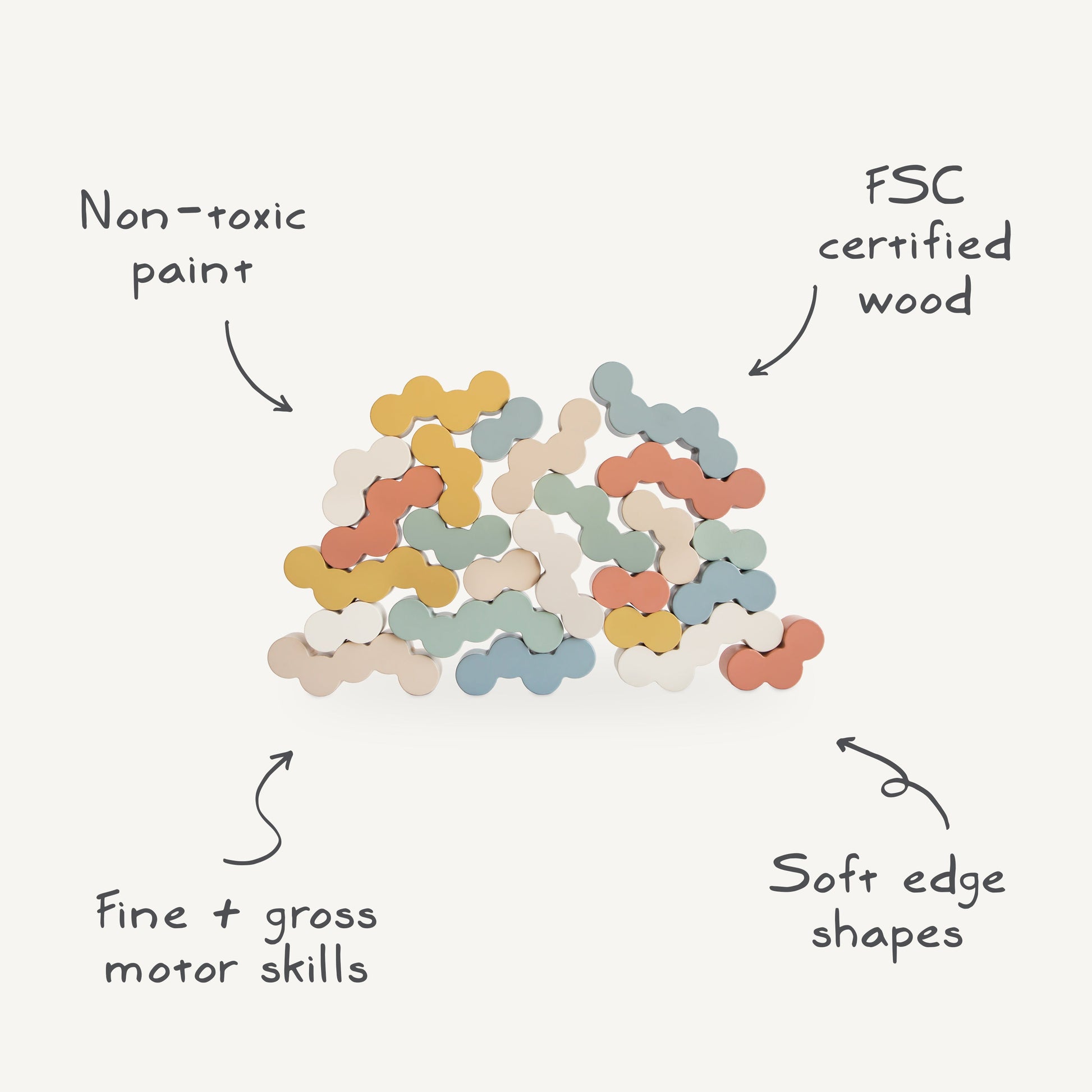Designed with a delightful rounded bubble shape, our wooden balance blocks add a playful twist to traditional stacking toys. Crafted from smooth, FSC-certified wood and painted in calming colors with non-toxic paint, these blocks are perfect for nurturing creativity and fine motor skills. The gentle curves and soft hues invite little hands to explore, balance, and build.
